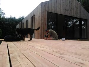 Je me suis concentré sur ma terrasse, surtout à partir de vendredi 8 mai (férié), j'ai été livré des lames de terrasse en douglas mercredi. Les choses ont bien avancées depuis. J'ai couvert environ un tiers à une moitié de la terrasse, j'ai commencé à couvrir la passerelle, et j'ai fait la structure du retour Est. Maintenant (dimanche soir) je n'ai plus de vis du tout, il me manque des bastaings pour le solivage... En gros, je dois me fournir et/ou attendre la prochaine livraison.
